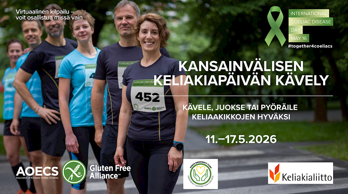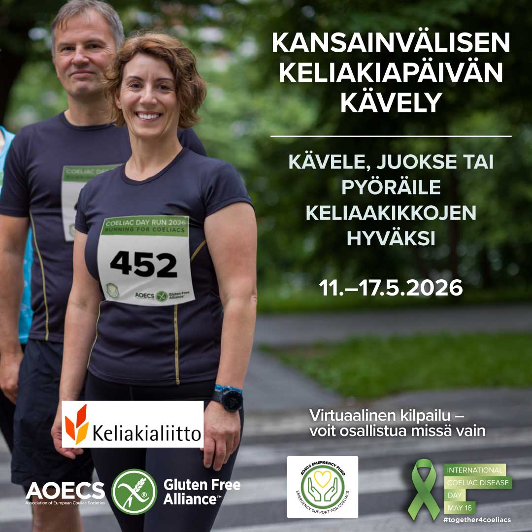 Kansainvälistä keliakiapäivää vietetään vuosittain 16.5. ja keliakiapäivän kävelyyn voi osallistua tänä vuonna 11.–17.5.2026. Voit osallistua itsenäisesti tai omalla keliakiayhdistyksen porukalla kävellen, juosten tai vaikka pyöräillen.