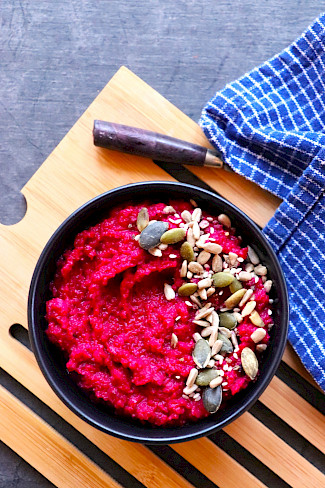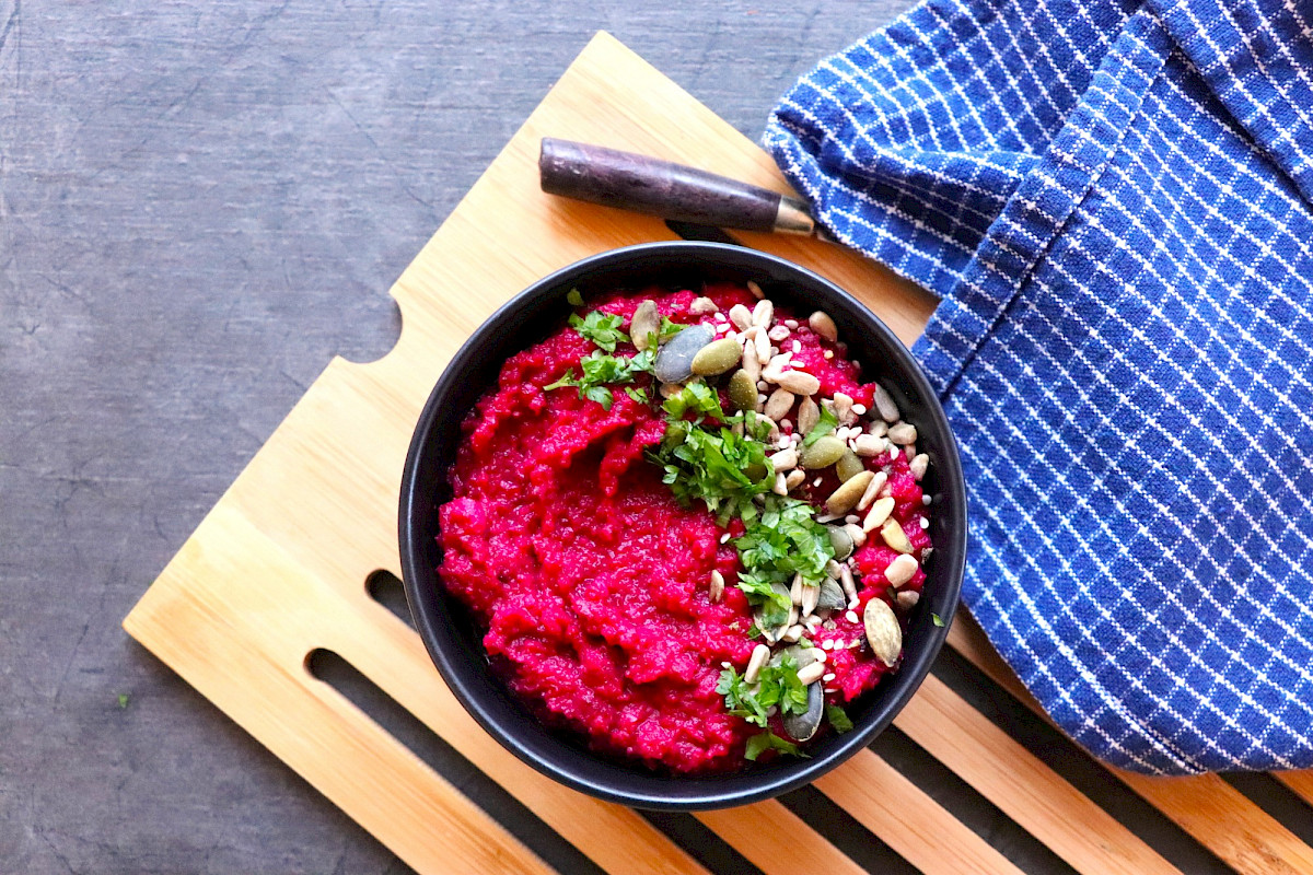 Vinkki! Voit myös paahtaa hummukseen tuoreita punajuuria; kuori ja lohko punajuuret. Mausta suolalla ja öljyllä. Paahda 200-asteisessa uunissa noin 45 minuuttia.