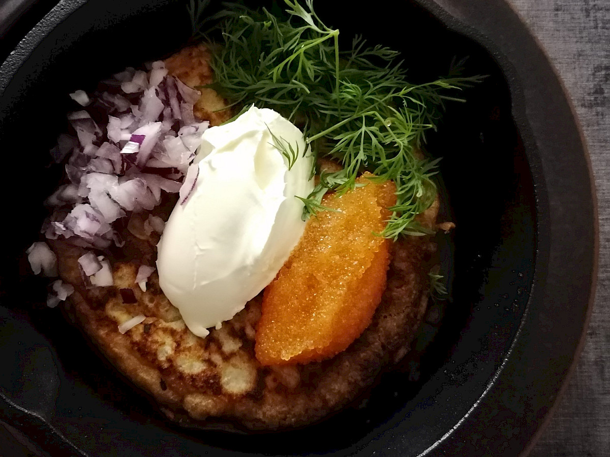 Tarjoa blinit smetanan, punasipulin ja mädin tai kylmäsavustetun lohen kanssa.