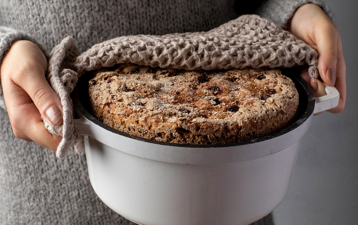 Levitä gluteenittomia jauhoja pöydälle ja kaavi taikina yhtenäisenä kulhosta pöydälle. Muotoile taikina leiväksi, vältä turvaa vaivaamista, jotta leivän ilmavuus säilyy. Ota kuuma pata uunista, laita taikina pataan ja anna kohota hetki. Laita pataan kansi päälle ja paista leipää 200-asteisessa uunissa 45 minuuttia. Ota kansi pois padan päältä ja jatka paistamista noin 15 minuuttia, kunnes leipä on kypsä ja pintakin on saanut hieman väriä. Ota leipä pois padasta jäähdytyksen ajaksi ja peitä leivinliinalla, jotta pataleipä säilyy pehmeänä ja rapeana